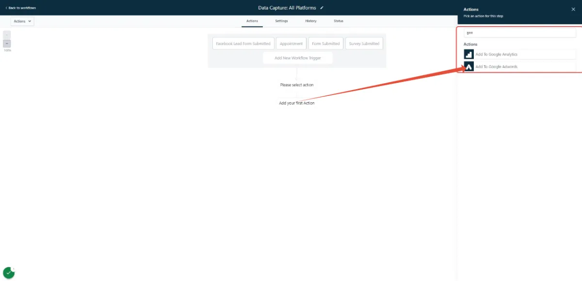 Navigieren Sie als Nächstes zu Ihrem Workflow und fügen Sie einen Schritt "Zu Google Adwords hinzufügen" hinzu. Wählen Sie für Konversion "Andere". Geben Sie den Konversionsnamen genau wie im vorherigen Schritt angegeben ein.