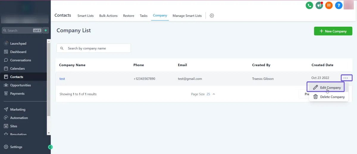 Um die Details eines bestehenden Unternehmens zu bearbeiten, gehen Sie zum Unternehmens-Tab, klicken Sie auf die 3 Punkte neben dem Unternehmen und wählen Sie Unternehmen bearbeiten: