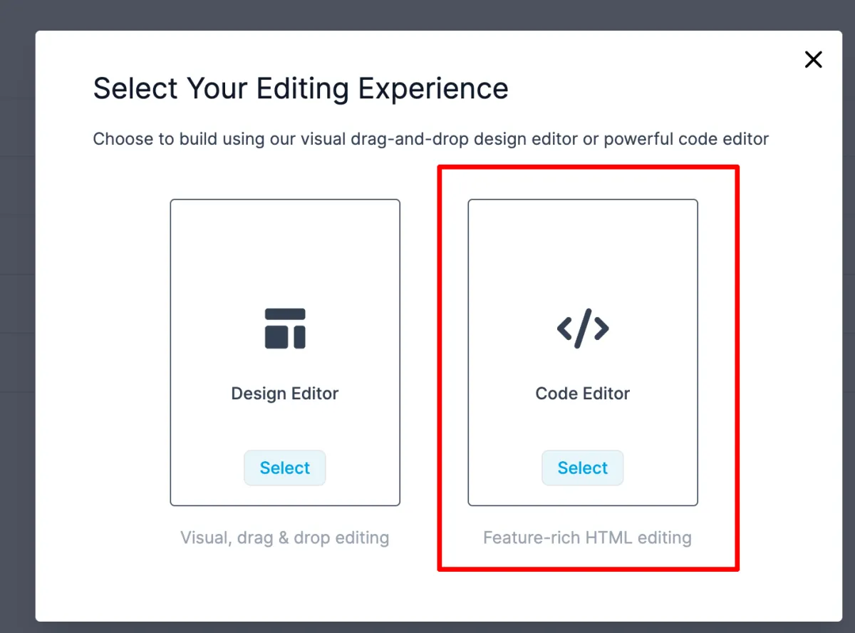 3. Es erscheint ein Popup-Fenster mit der Option Design-Editor (Drag-and-Drop-Builder) und Code-Editor (HTML-Builder). Der Benutzer muss den Code-Editor auswählen.
