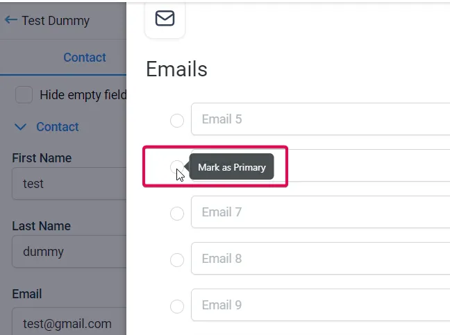 Sobald aktiviert wird, können Benutzer mehrere E-Mail-Adressen für einen Kontakt hinzufügen, bearbeiten und verwalten. Dies kann beim Erstellen eines neuen Kontakts oder beim Bearbeiten eines bestehenden Kontakts erfolgen. Benutzer können angeben, welche E-Mail-Adresse die primäre ist, die für alle Kommunikationen und Interaktionen mit diesem Kontakt verwendet wird. Dies kann in Fällen hilfreich sein, in denen ein Kontakt mehrere E-Mail-Adressen für unterschiedliche Zwecke hat, wie z.B. Arbeits- und persönliche E-Mail-Adressen.
