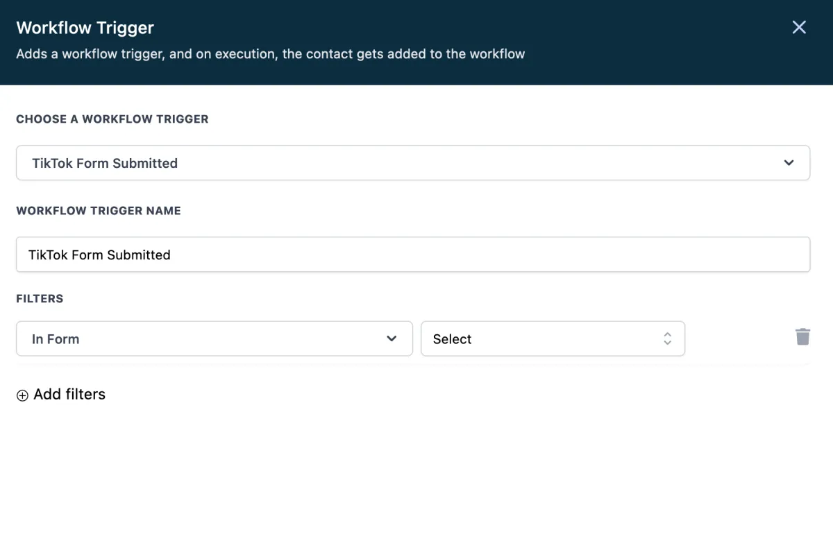 Schritt 4: Erstellen Sie Ihren TikTok Lead Ads WorkflowBitte fügen Sie einen Workflow-Auslöser hinzu 'TikTok Formular eingereicht'> Filter hinzufügen > Formular auswählen