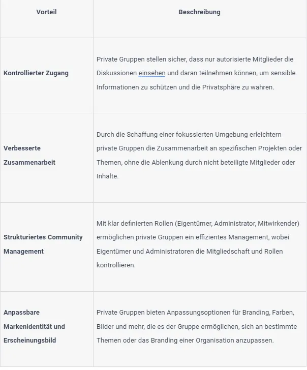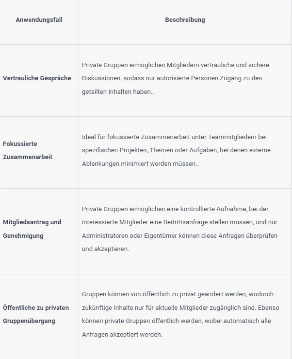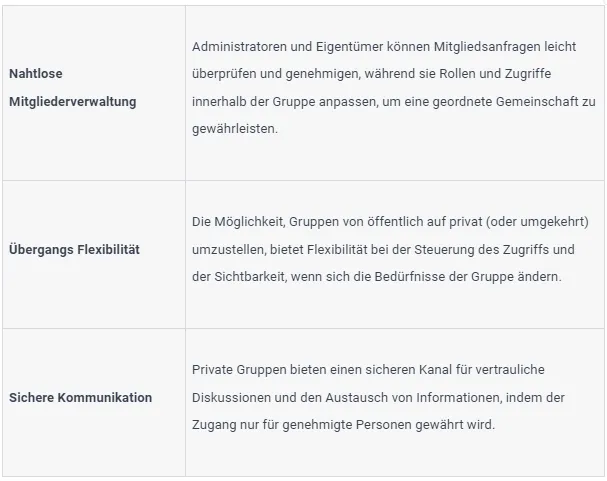 Darüber hinaus ermöglichen private Gruppen den Wechsel zwischen öffentlichem und privatem Status. Diese Flexibilität gewährleistet, dass Inhalte kontrolliert werden können und die Gruppe sich entsprechend ihren Zielen entwickeln kann. Ob für interne Kommunikation innerhalb eines Unternehmens, exklusives Community-Engagement oder fokussierte Zusammenarbeit, private Gruppen bieten einen sicheren und organisierten Raum für Mitglieder, um sich zu verbinden und zu interagieren.