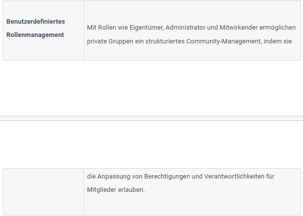 Die Tabelle beschreibt die allgemeinen Fähigkeiten jeder Rolle in privaten Gruppen.