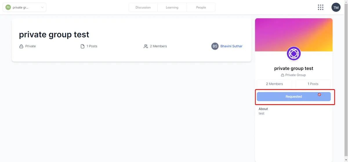 Beitrittsanfrage: Interessierte Mitglieder klicken auf die Gruppen-URL und beantragen die Mitgliedschaft. Der Anfrage-Button sollte zu "Angefragt" wechseln.
