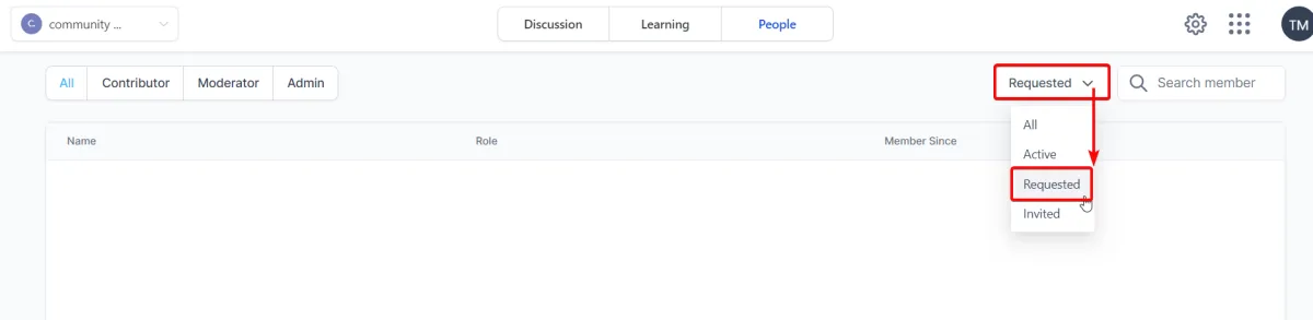 > Anfragen prüfen und genehmigen: Admins und Eigentümer können Anfragen im Abschnitt "Personen" über den Filter "Angefragt" prüfen und akzeptieren oder ablehnen.