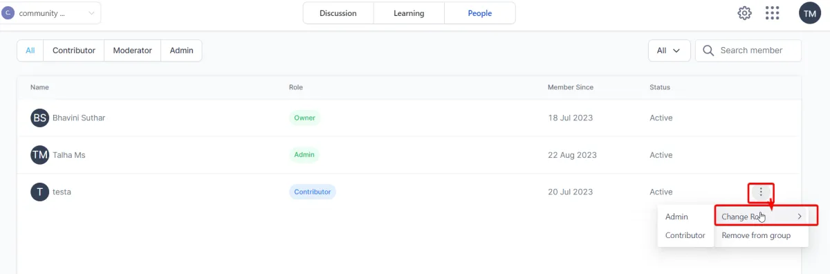 >Anpassung von Rollen: Eigentümer und Administratoren können Mitgliedern Rollen zuweisen (Administrator/Beitragender). Die Rolle eines Eigentümers kann nicht neu zugewiesen werden.