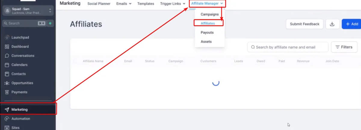 Melden Sie sich als Sub-Account-Administrator in Ihrem CRM-Konto an. Bitte navigieren Sie zum Affiliate-Manager-Bereich, wo Sie Ihre Affiliates verwalten und deren Leistung nachverfolgen können.