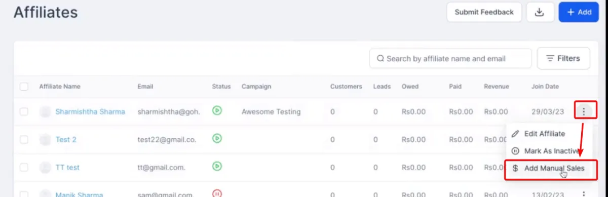 Klicken Sie auf die drei Punkte neben dem Namen des Affiliates, und es erscheint ein Dropdown-Menü. Wählen Sie aus dem Dropdown-Menü "Manuellen Verkauf hinzufügen". Dadurch wird ein neues Pop-up-Fenster geöffnet.