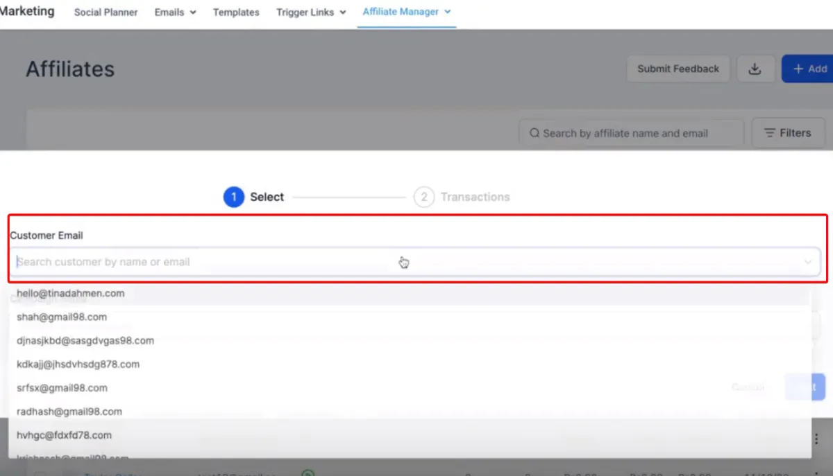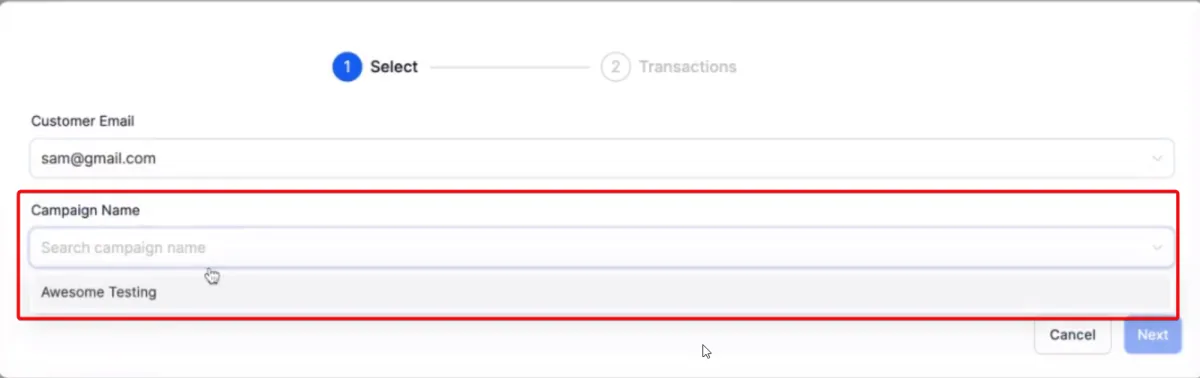 Nachdem Sie die E-Mail-Adresse des Kunden eingegeben haben, müssen Sie den Kampagnennamen oder die Konfiguration auswählen, die Sie für diesen Kunden anwenden möchten. Dieser Schritt stellt sicher, dass der Verkauf der richtigen Affiliate-Kampagne zugeordnet wird.