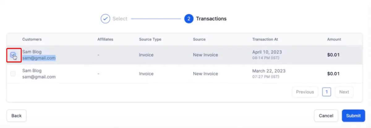 Überprüfen Sie die Liste der Transaktionen und wählen Sie diejenigen aus, die Sie dem ausgewählten Affiliate zuordnen möchten. Sie können eine oder mehrere Transaktionen auswählen, um den Affiliate genau zu vergüten.