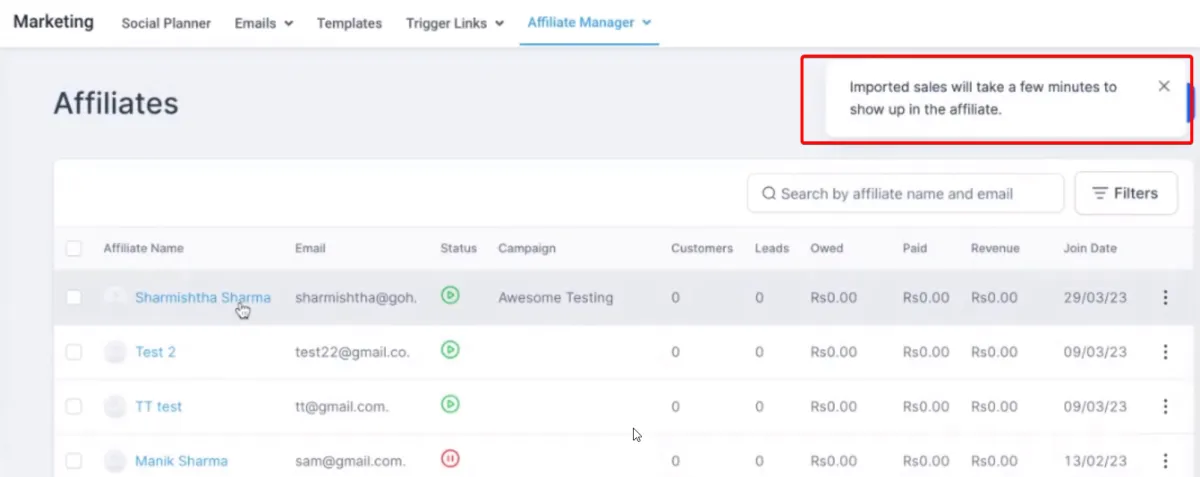 Die zugeordneten Verkäufe können einige Momente dauern, bis sie im Konto des Affiliates erscheinen. Sobald der Prozess abgeschlossen ist, können Sie überprüfen, ob die Verkäufe korrekt dem Affiliate zugeordnet wurden.