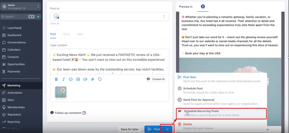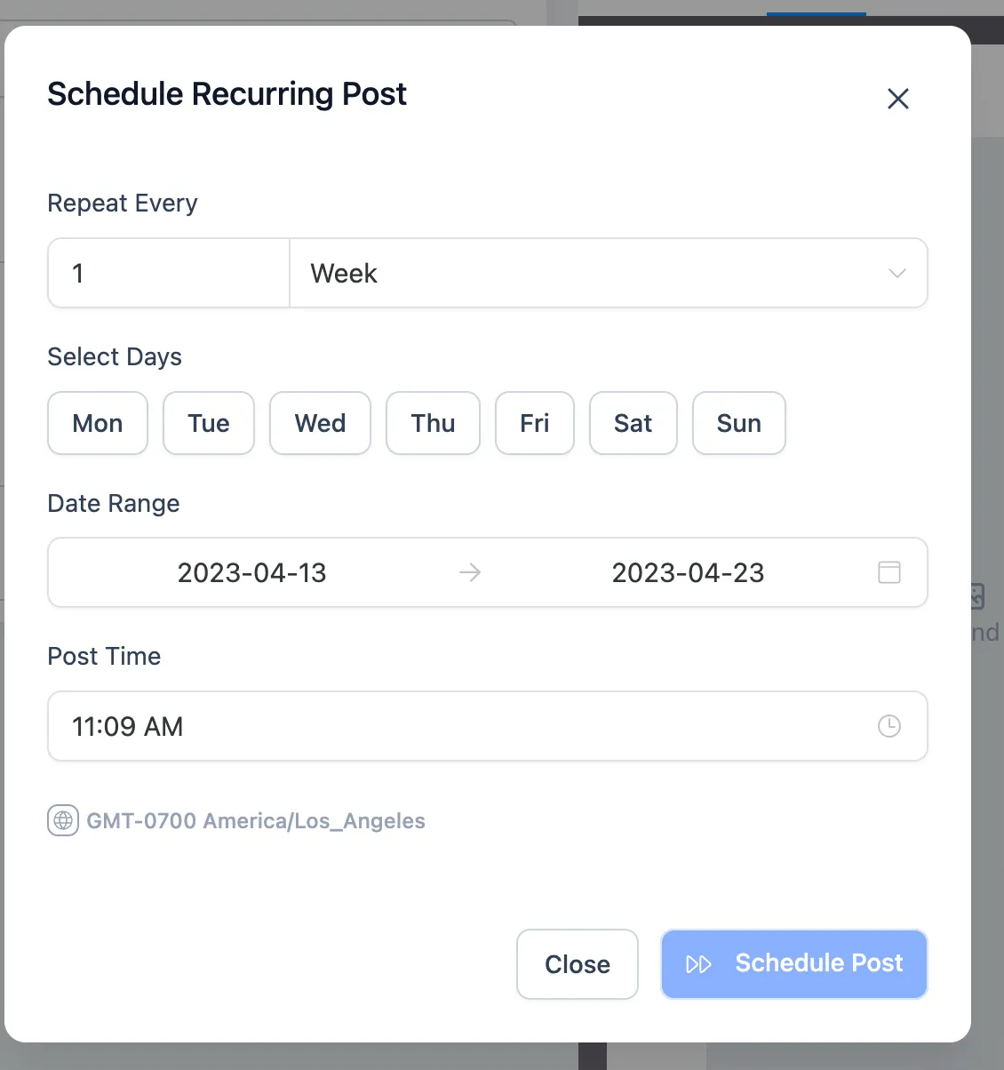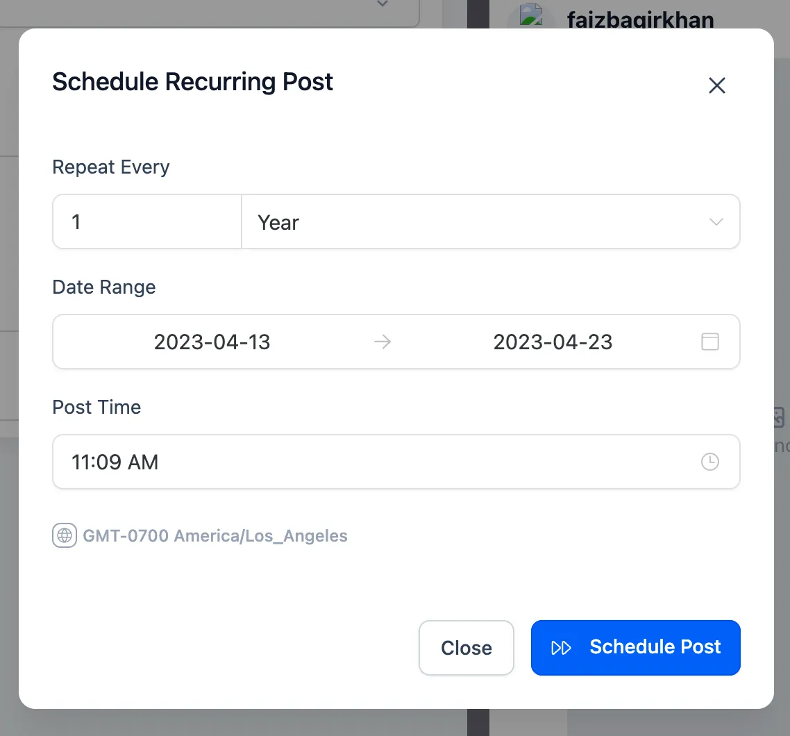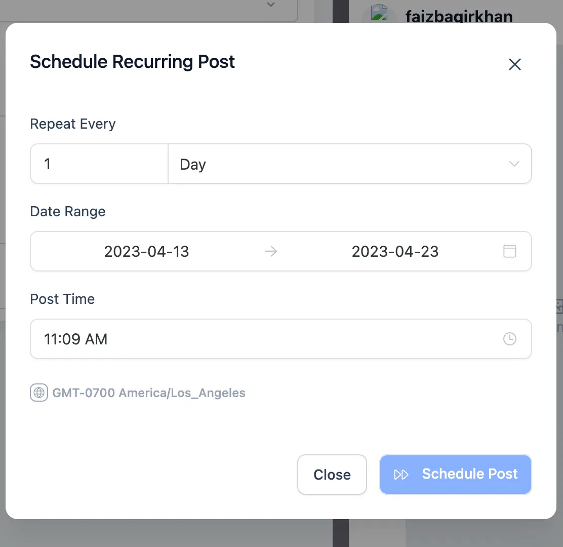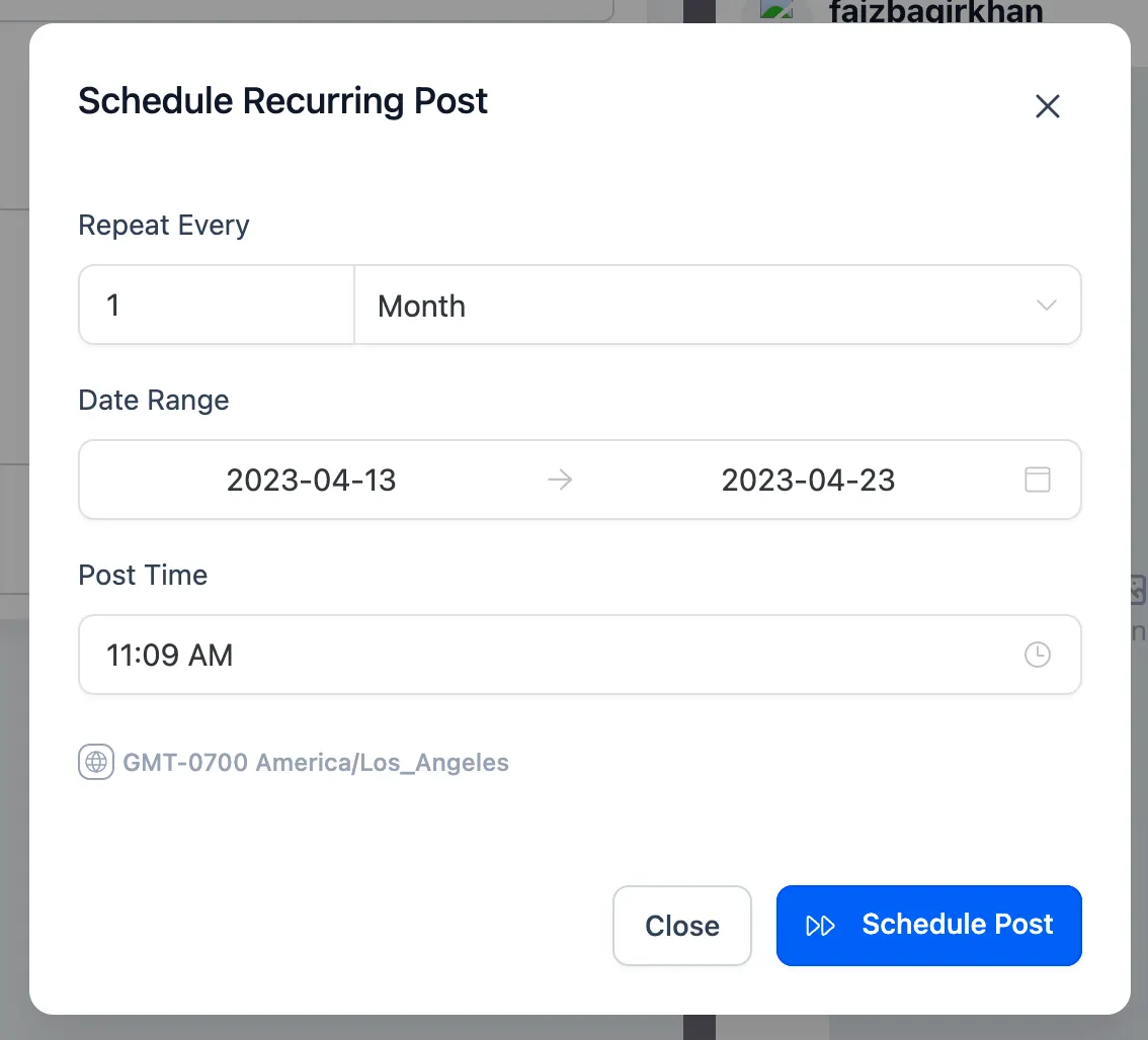 A: Sie müssen die Zeit für Ihre wiederkehrenden Beiträge unter Berücksichtigung der Zeitzone Ihres Zielpublikums einstellen. Achten Sie gegebenenfalls auf globale Zielgruppen.