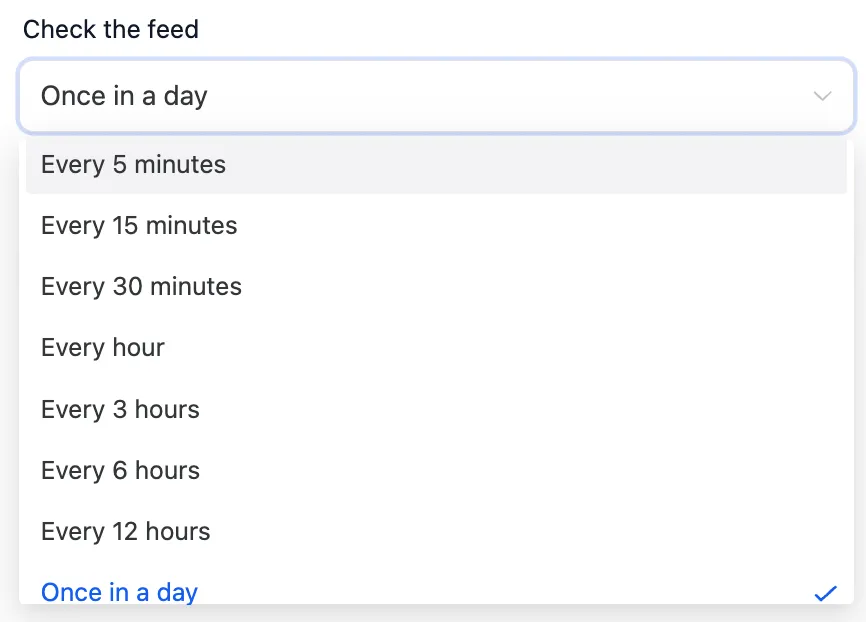 1. Wählen Sie die Option, um das Feed-Update zu aktualisieren - von alle 5 Minuten auf einmal am Tag