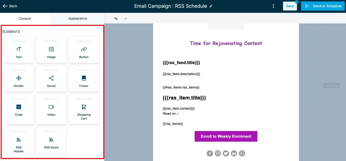 Im E-Mail-Marketing, wenn Sie eine RSS-E-Mail erstellen, gibt es die Möglichkeit, die Vorlage auszuwählen, den Inhalt zu gestalten und die Einstellungen für den Empfang und die Zustellmethode als RSS-Zeitplanung für täglich, wöchentlich und mehr zu wählen.
