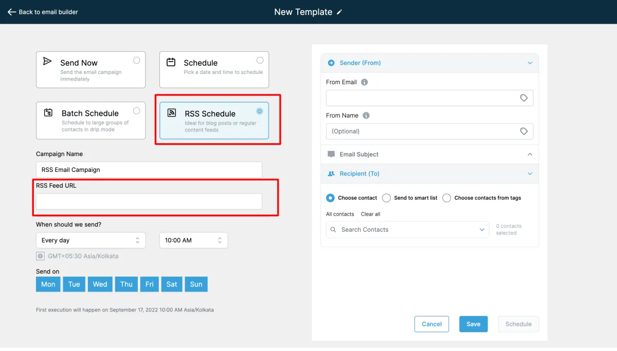 Schritt 9: Der Zeitpunkt, zu dem die RSS-E-Mail-Kampagne gesendet werden soll