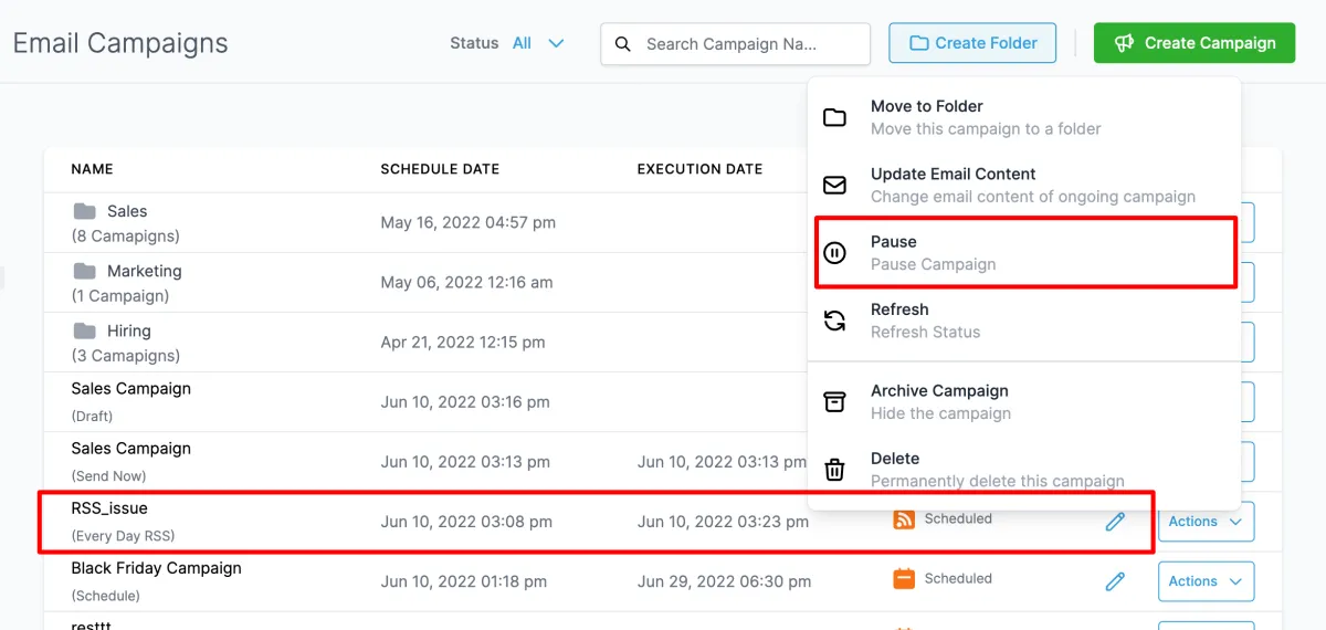 - Für die RSS-E-Mail-Kampagne wird eine Pause-Option verfügbar sein.
