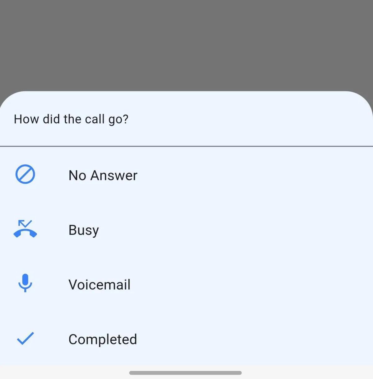 Wenn es sich um einen manuellen Anruf handelt, wird das Anruffenster erscheinen, und Sie können eine Option basierend darauf auswählen, wie Ihr Anruf verlief, was in Ihrem Anrufbericht reflektiert wird.