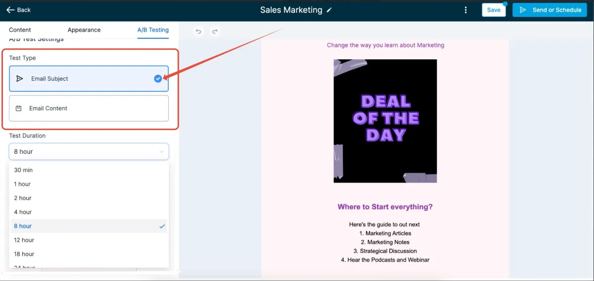 Schritt 1: Gehe zu Marketing > E-Mails > Wähle "Kampagne" aus dem Dropdown-Menü. Nachdem eine neue E-Mail-Kampagne erstellt wurde, gibt es eine Option, um "A/B-Testing" zu aktivieren.