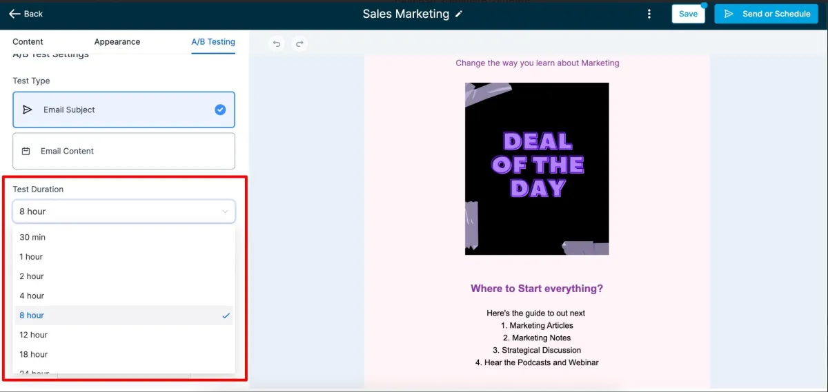 Die während der Testphase gesammelten Daten können verwendet werden, um die gewinnende Kombination der E-Mail-Kampagne zu bestimmen. Die Testdauer liegt zwischen 30 Minuten und 24 Stunden.