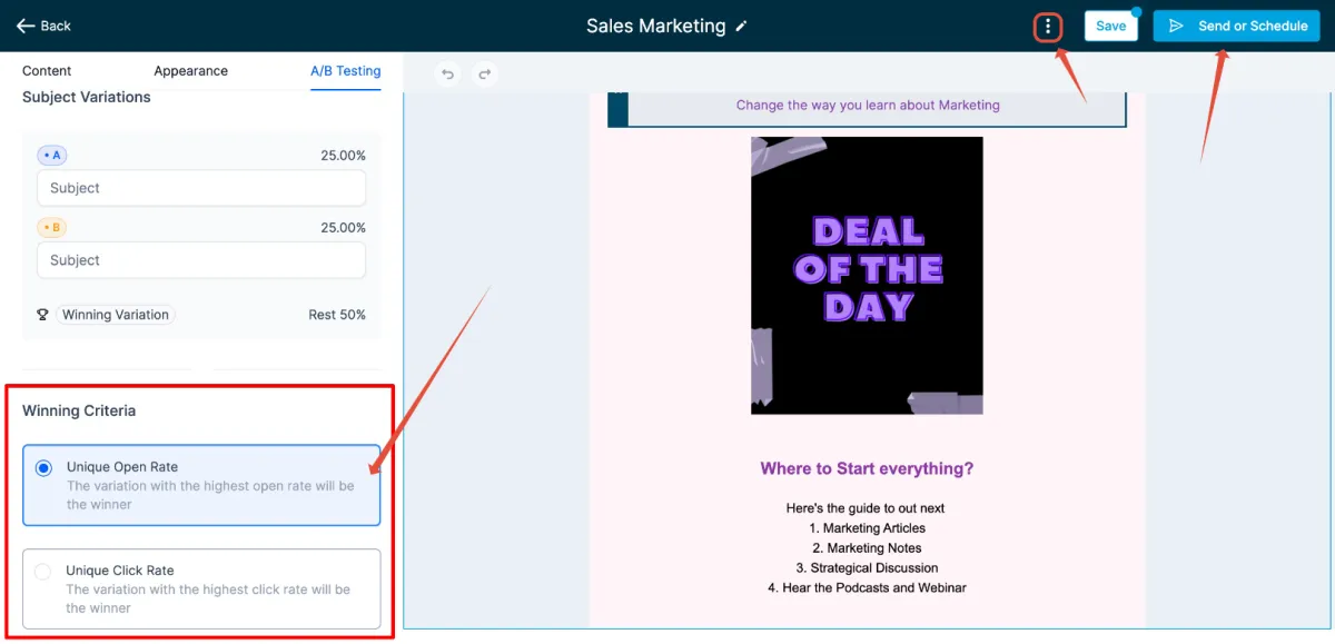 Sobald die A/B-Test-E-Mails vorbereitet sind und Sie zufrieden sind, können Sie die E-Mail-Kampagne testen oder eine Vorschau der Kampagne anzeigen, indem Sie auf die 3 Punkte klicken.