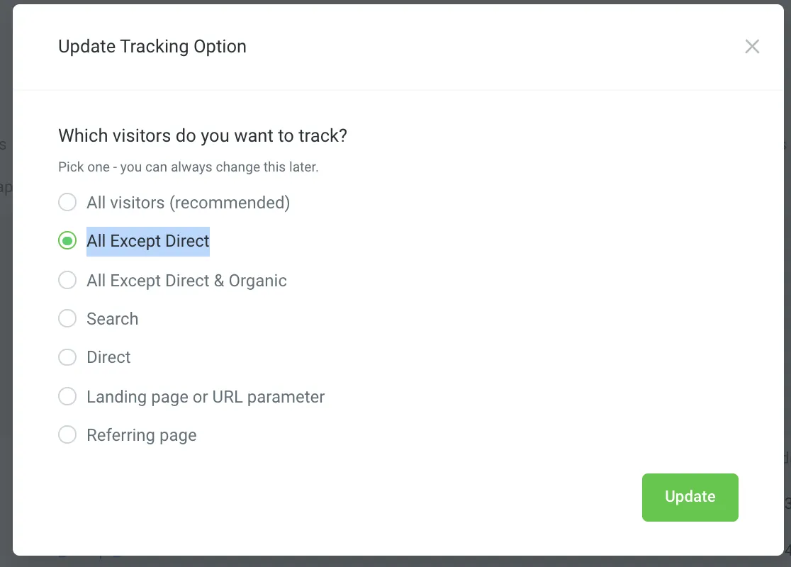 Wenn die Tracking-Option "Alle außer Direkt" ausgewählt ist, müssen wir die Zielseiten-URL von einer anderen Webseite verlinken, anstatt den Link direkt aus dem Browser einzugeben, um ihn zu testen.