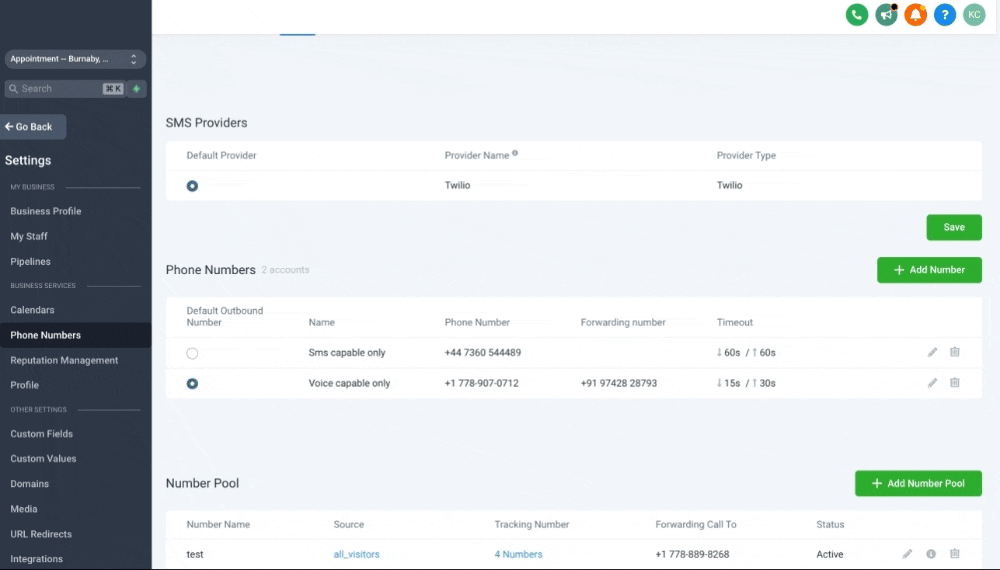 Jede Nummer in einem Nummernpool wird zum gleichen Tarif wie eine Standardtelefonnummer in Ihrem Konto abgerechnet. Pro Pool sind mindestens vier Nummern erforderlich, d. h. für jede dieser Nummern fallen Gebühren an. Wenn Sie LC-Twilio verwenden, gelten die Standardpreise von Twilio (z. B. 1 $/Monat pro US-Nummer zzgl. Nutzung). Wenn Ihre Agentur Ihr eigenes Twilio nutzt, hängen die Preise von Ihren Twilio-Kontoeinstellungen ab. Beachten Sie, dass größere Pools mehr kosten. Wählen Sie daher die Poolgröße entsprechend Ihrem Datenverkehr. Sie können die Kosten für Telefonnummern jederzeit unter Unterkonto > Einstellungen > Telefonnummern einsehen oder anpassen.