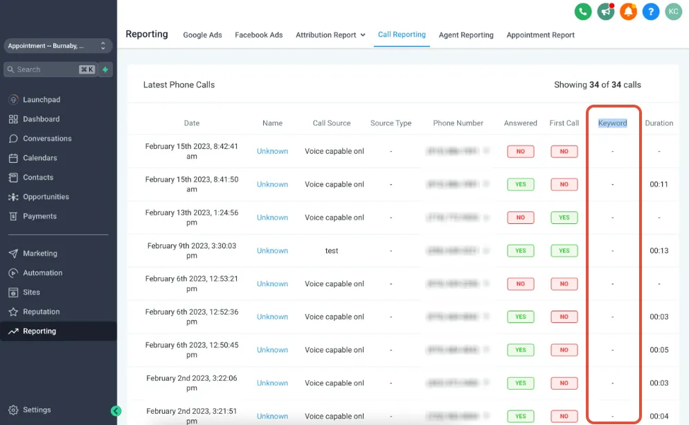 Sobald der Nummernpool eingerichtet und betriebsbereit ist, können Sie im „Anrufbericht“ unter „Berichte“ die Spalte „ Schlüsselwort “ einsehen .