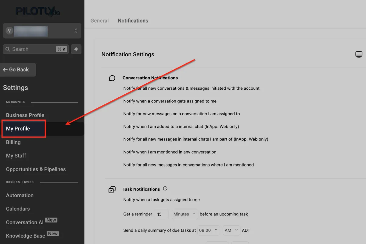 Klicken Sie im Menü „Einstellungen“ auf „Mein Profil“ . In diesem Bereich können Sie Ihre Benachrichtigungseinstellungen für Unterhaltungen, Aufgaben und mehr anpassen.
