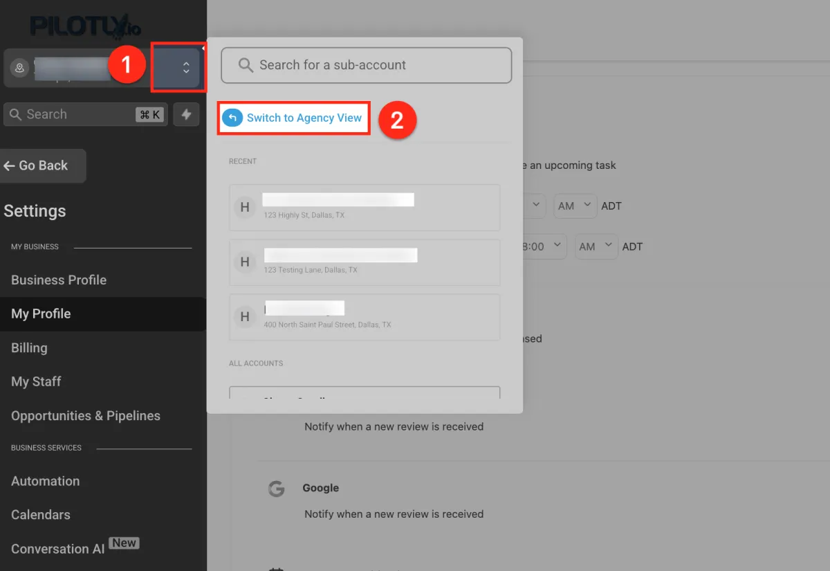 Klicken Sie auf das Dropdown-Menü zum Kontowechsel (1) und wählen Sie dann „ Zur Agenturansicht wechseln“ (2). So können Sie Benutzer und Berechtigungen auf Agenturebene verwalten und Unterkonten für Benachrichtigungen zuweisen.