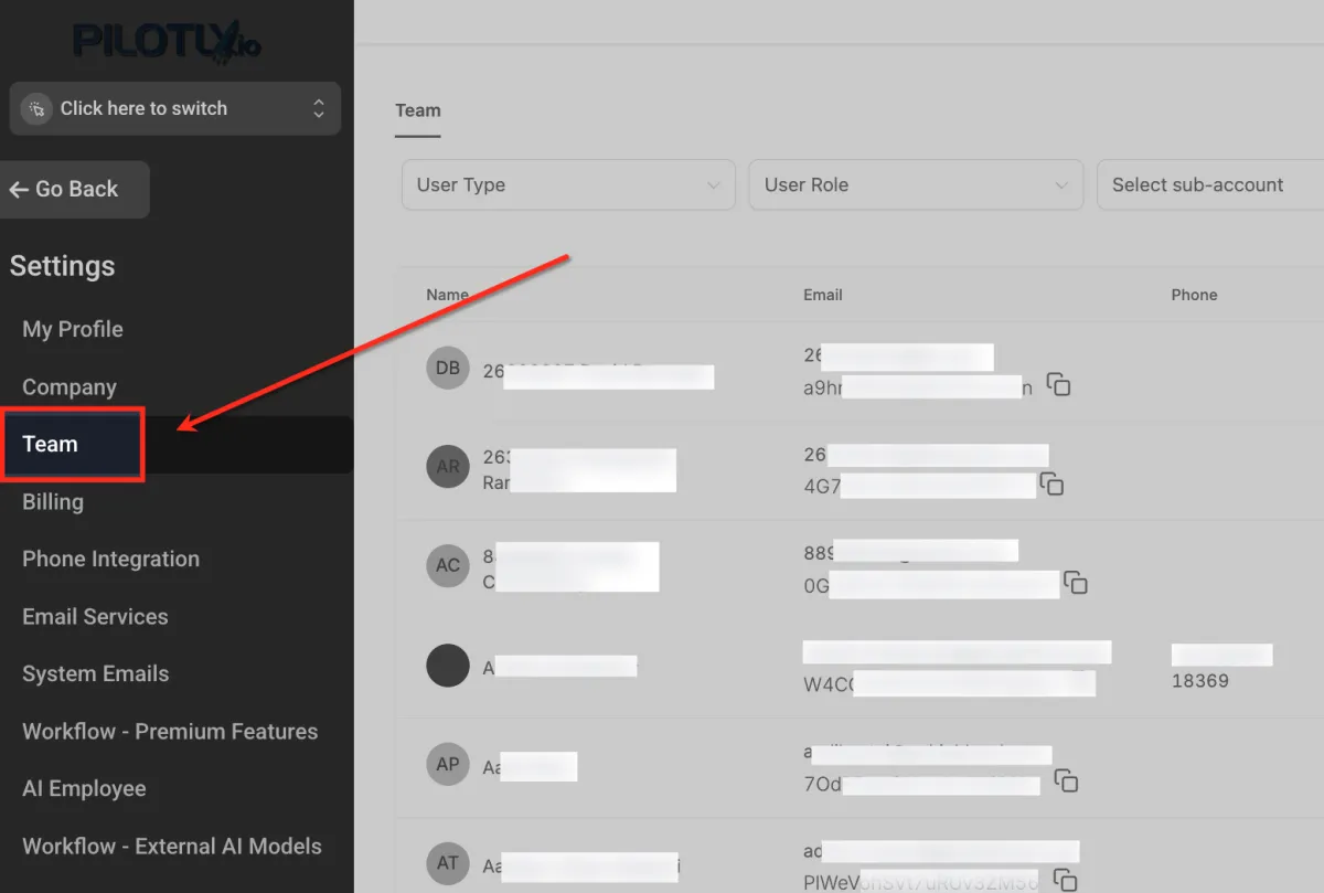 Klicken Sie im Menü „ Agentureinstellungen “ auf „Team“ . Hier finden Sie die Liste aller Benutzer und können deren Rollen, Berechtigungen und Unterkontozugriff verwalten.