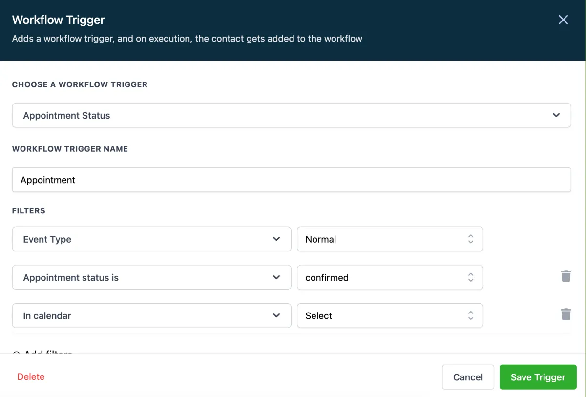 Wählen Sie als Auslöser „ Terminstatus “ und fügen Sie die folgenden Filter hinzu: