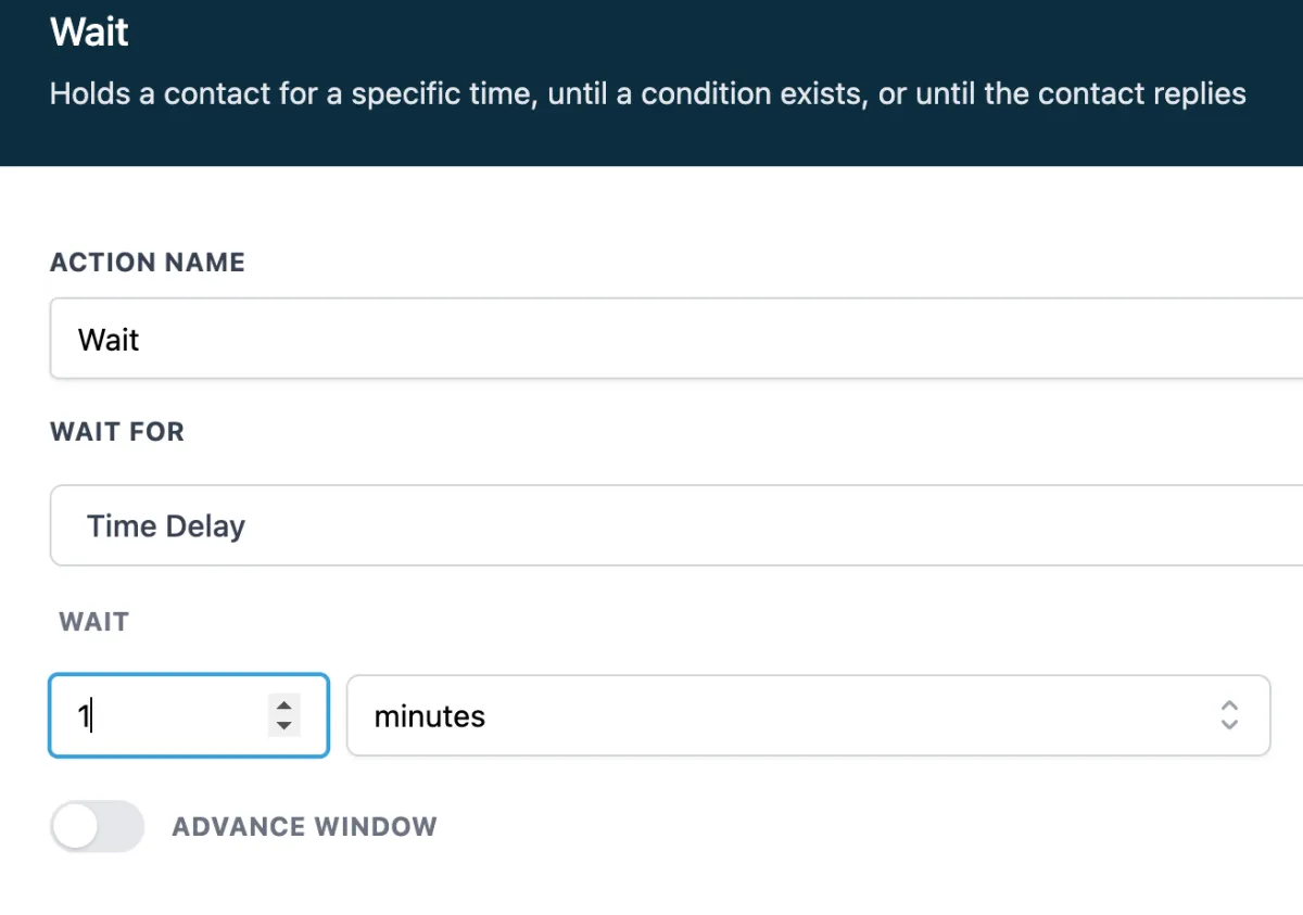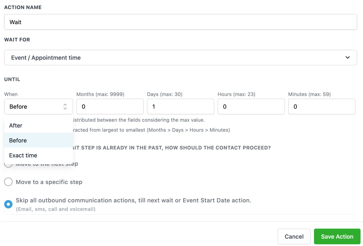 Der letzte Schritt besteht darin, die Kadenz der Benachrichtigungen mithilfe der Wartezeit „ Ereignis-/Terminzeit “ im Einklang mit den vorherigen Aktionen „E-Mail/SMS senden“ und „Interne Benachrichtigung“ zu definieren .