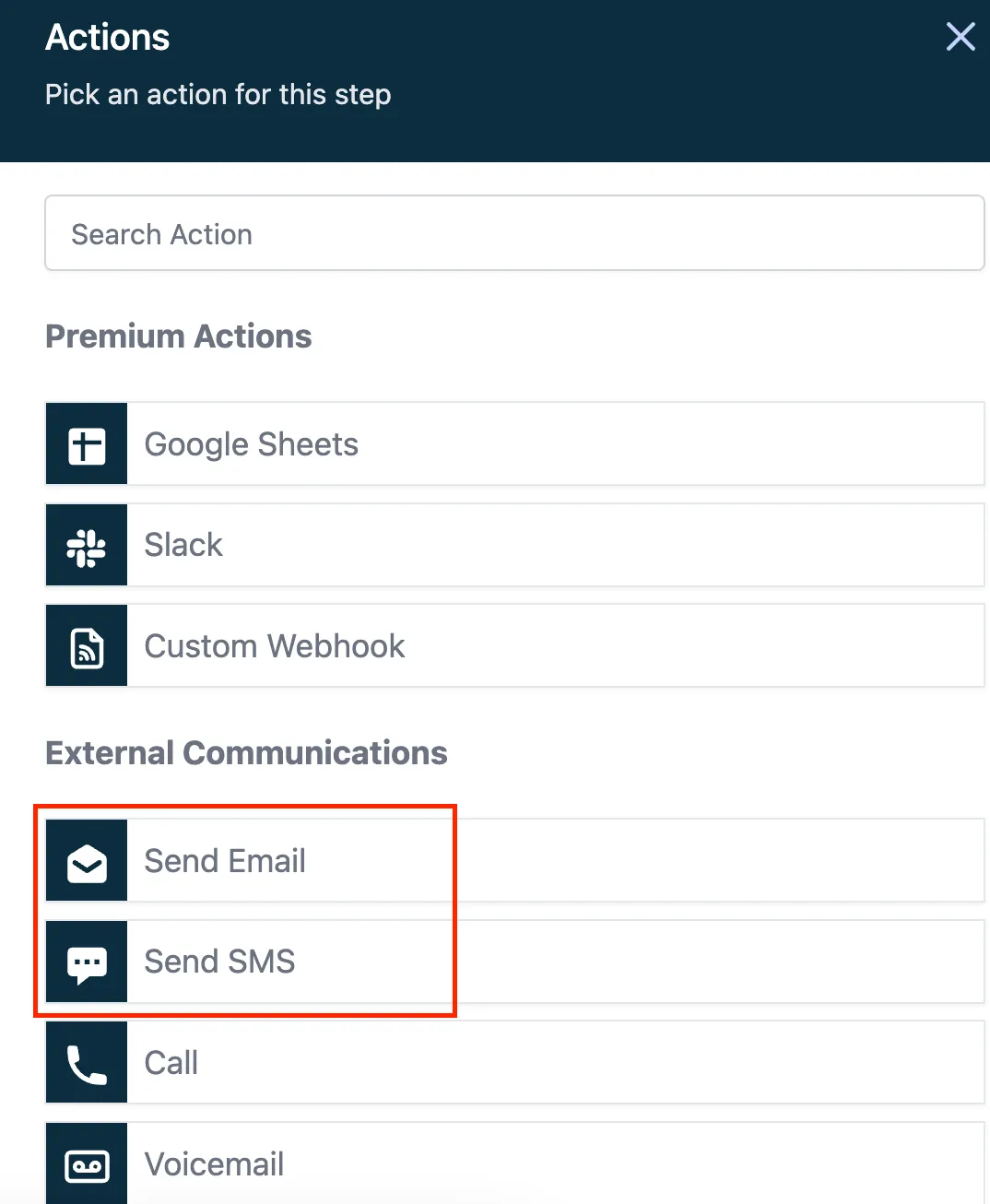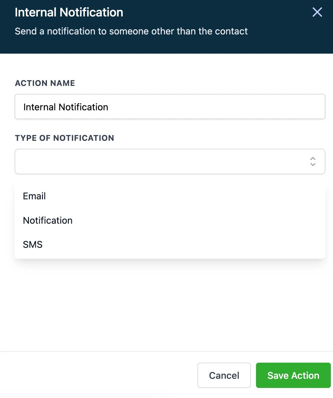 Optional können Sie mit der Aktion „ Interne Benachrichtigung“ E-Mails, SMS und In-App-Terminerinnerungen an den zugewiesenen Benutzer oder einen beliebigen externen Kontakt senden .