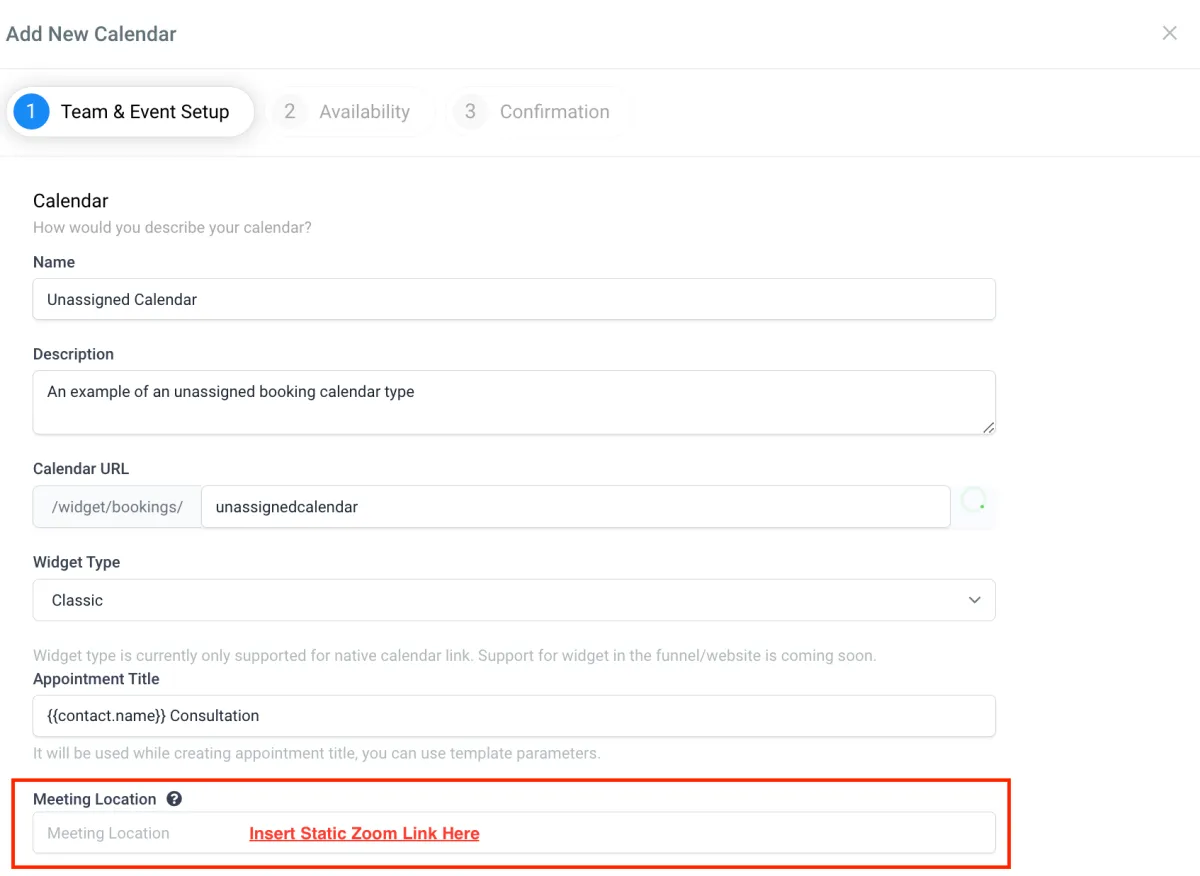 Nicht zugewiesene Buchungskalender können statische oder vorgenerierte Zoom-Meeting-Links verwenden, indem Sie den statischen Link manuell zur Meeting-Standorteinstellung unter „Team- und Event-Setup“ hinzufügen.