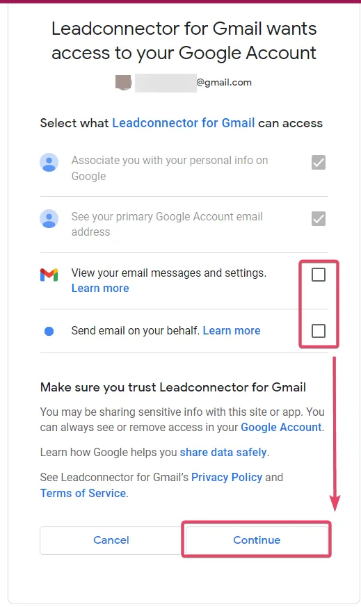 Wenn Sie es verbinden, wird es Sie dann nach den Berechtigungen fragen, die Sie LeadConnector für Ihren Gmail-Account erteilen möchten. Stellen Sie sicher, dass Sie alle zulassen und dann auf "Aktivieren" und "Weiter" klicken.