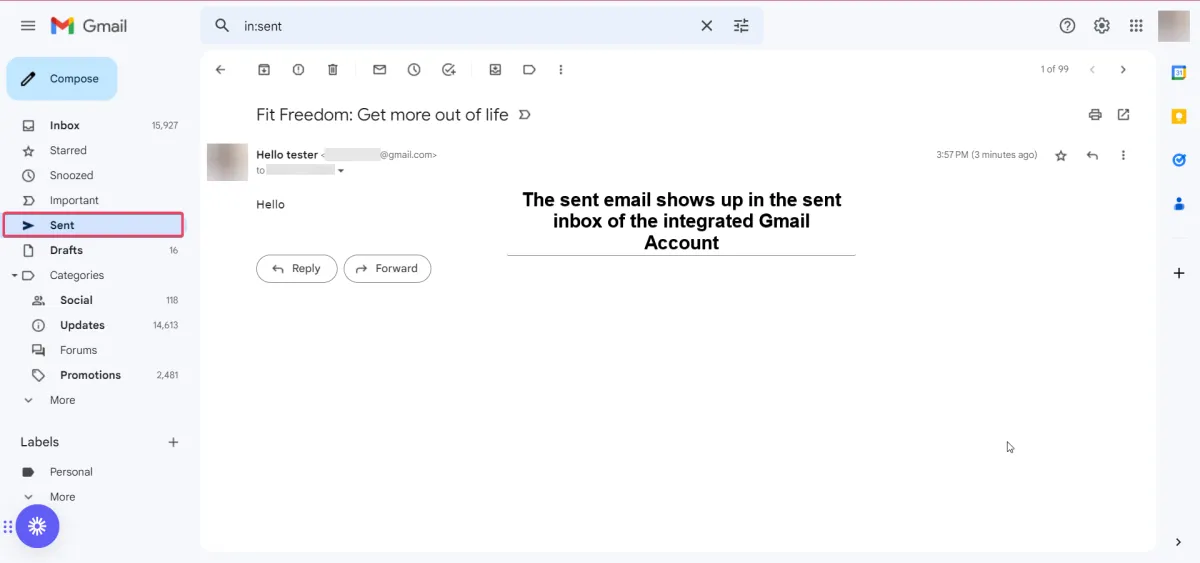 Die versendete E-Mail wird im gesendeten Postfach des integrierten Gmail-Kontos angezeigt.