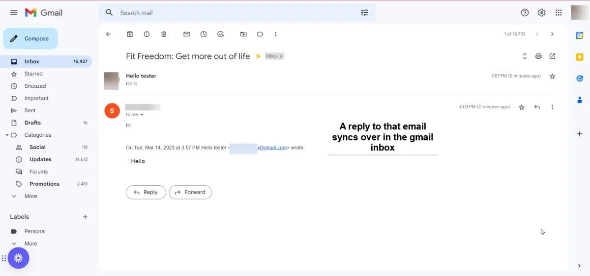 Neue eingehende E-Mails von bestehenden Kontakten werden als neue E-Mails im CRM und in Gmail angezeigt. Wenn die E-Mail zu einem bestehenden Gesprächsverlauf gehört, wird sie als neue E-Mail im selben Verlauf angezeigt.