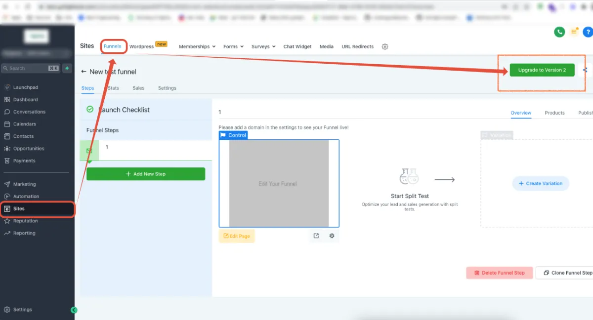 2. Gehen Sie zu Sites > Trichter und öffnen Sie den Trichter, den Sie aktualisieren möchten