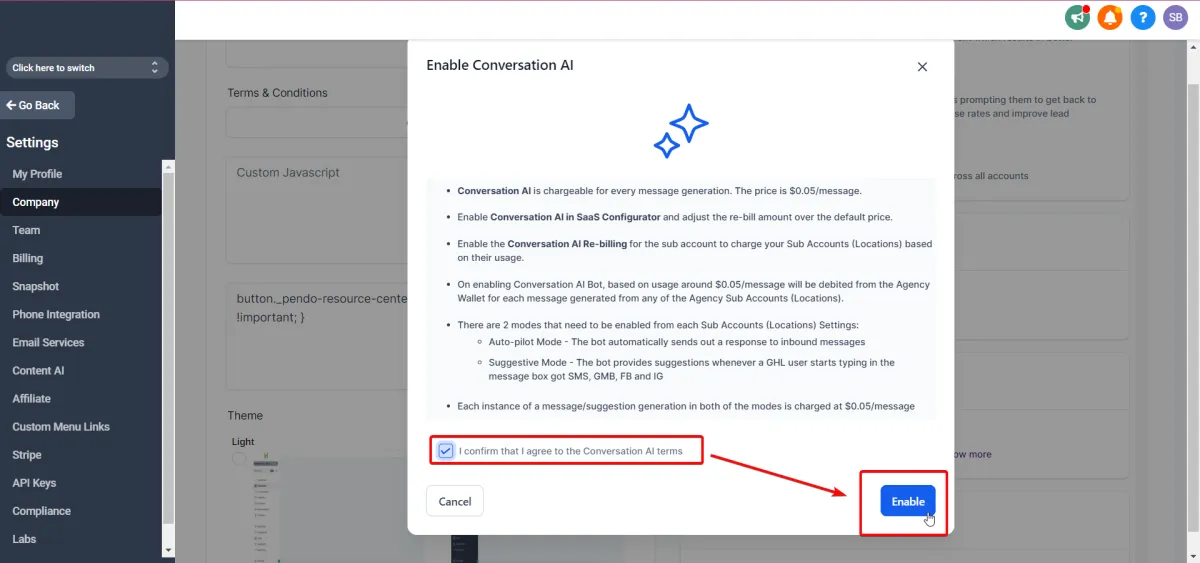 Gehen Sie zu den Firmeneinstellungen und scrollen Sie dann auf der rechten Seite nach unten. Dort sollte eine Option oder ein Kontrollkästchen sein, um Conversation AI zu aktivieren. Klicken Sie darauf, um die Funktion einzuschalten.