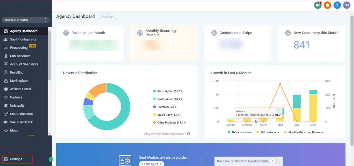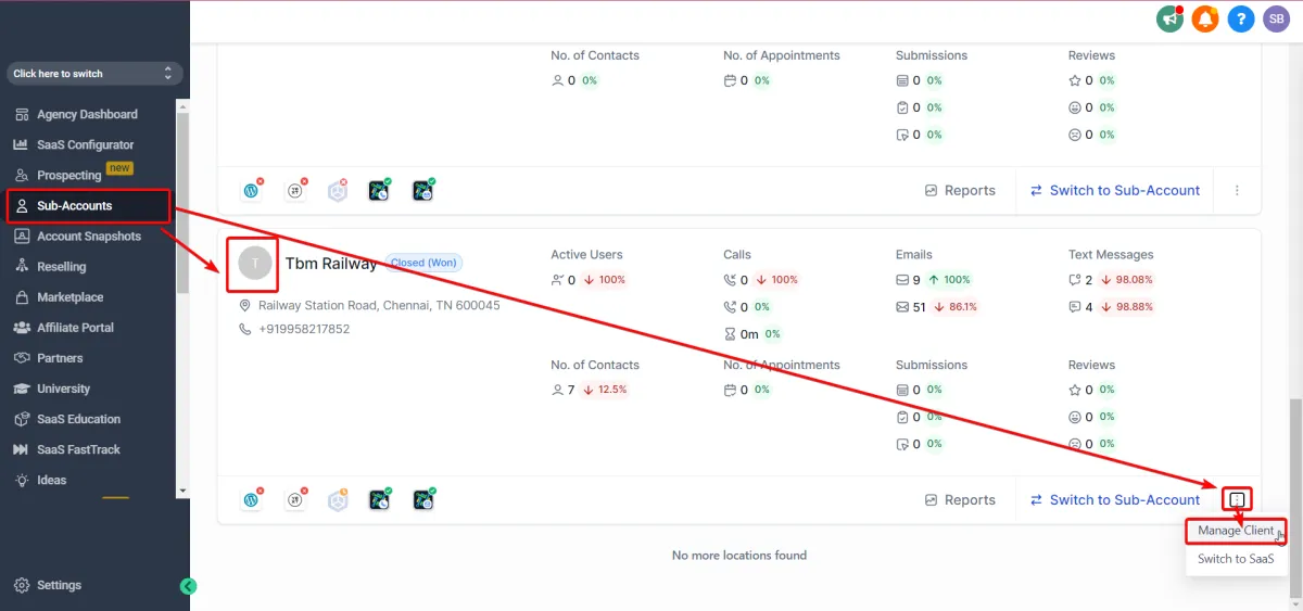Sie können den Wiederabrechnungsmultiplikator für einzelne SAAS-Konten ändern, indem Sie zu Unterkonten navigieren > zu diesem Unterkonto scrollen > Klienten verwalten (oder auf deren Namen klicken).