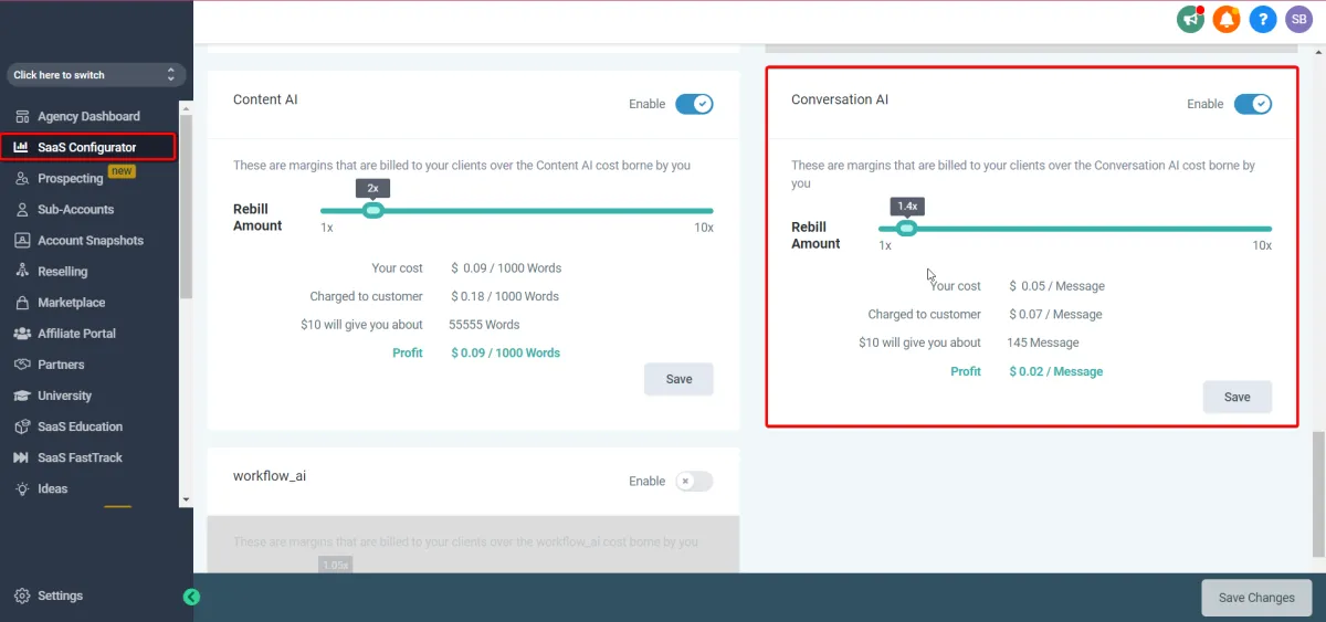 Scrollen Sie nach unten, bis Sie den Bereich zur Verwaltung der erneuten Abrechnung von Unter-Konten sehen> Conversation AI: