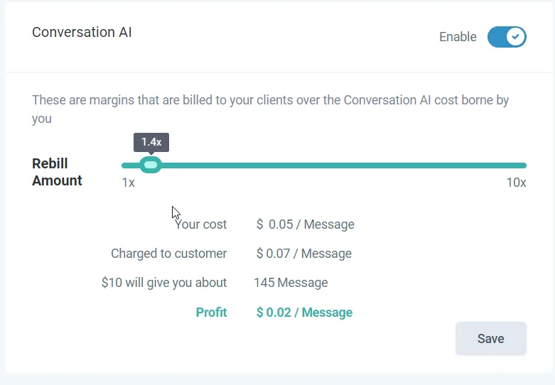 Geben Sie den Betrag ein, den Sie Ihren Kunden pro Nachricht berechnen möchten. Wenn Ihre Kosten beispielsweise bei 0,05 $ pro Nachricht liegen und Sie Gewinn erzielen möchten, könnten Sie den Kunden 0,07 $ berechnen.