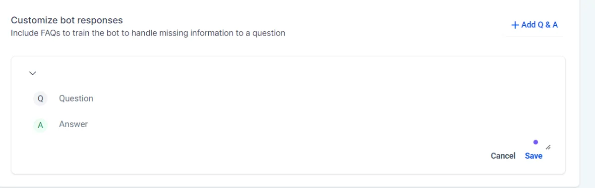 Im Abschnitt "Bot-Antworten anpassen" können Sie mit dem Button "+ Add Q & A" häufig gestellte Fragen (FAQs) und ihre Antworten einfügen. Dies trainiert den Bot, Anfragen effektiv zu bearbeiten. Zum Beispiel: