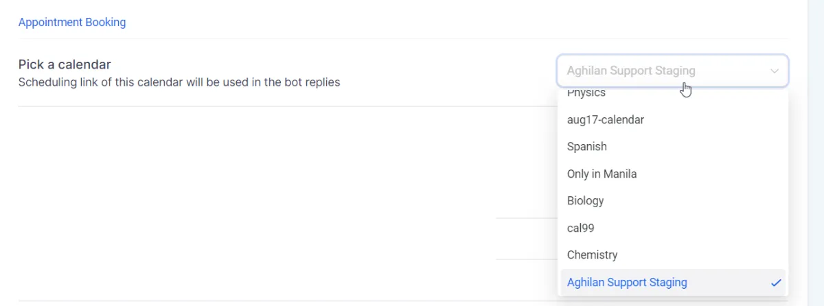 Im Abschnitt "Terminbuchung" werden Sie gebeten, einen Kalender aus Ihrem CRM auszuwählen. Der zugehörige Terminplanungslink wird automatisch ausgewählt, wenn Sie einen bestimmten Kalender auswählen. Dieser Link wird dann in den Antworten des Bots verwendet, damit Kunden Termine buchen können. So ermöglichen Sie eine nahtlose Integration der Terminplanung Funktionen Ihres CRM-Systems mit der automatisierten Kundeninteraktion des Conversation AI.