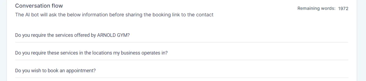 Im Abschnitt "Gesprächsablauf" können Sie den Dialog des AI-Bots mit Ihren Kunden steuern. Er wird die festgelegten Fragen stellen, bevor er den Buchungslink mit dem Kontakt teilt. Die verbleibende Wortanzahl zeigt an, wie viele Wörter Sie noch für diese Dialoganpassung nutzen können.