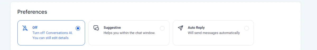 Diese Option deaktiviert Conversation AI vollständig. Sie können Einstellungen und Details bearbeiten, aber die KI wird nicht mit Ihren Kunden interagieren.