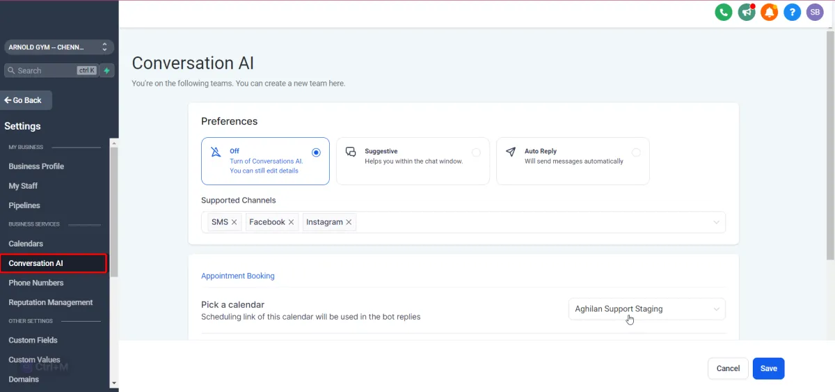 Bevor Sie mit dieser Funktion beginnen können, müssen Sie sie in einem Unter-Konto aktivieren und dann zum Einstellungen-Tab > Conversation AI navigieren:
