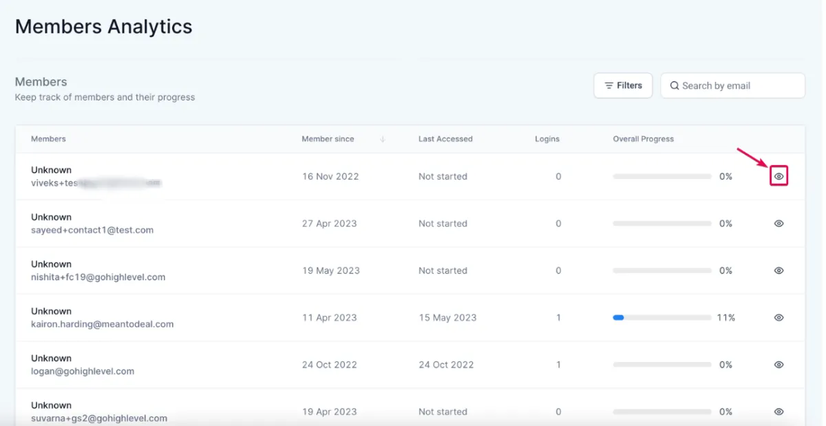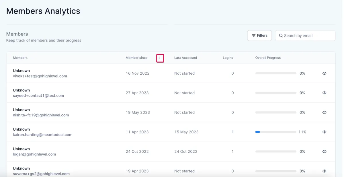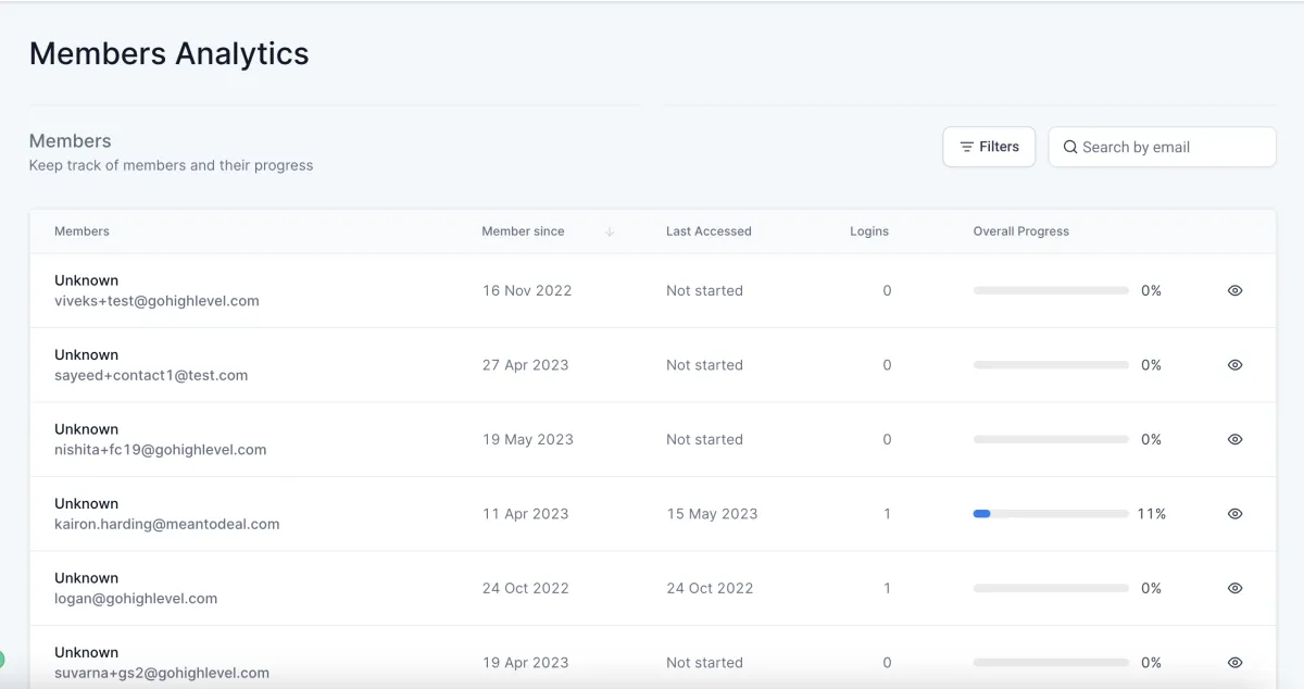2. Listenansicht erkunden: In der Mitgliederanalyse-Oberfläche finden Sie normalerweise eine Listenansicht, die wichtige Details über Ihre Mitglieder anzeigt. Dazu gehören ihre Namen, E-Mail-Adressen, Beginn der Mitgliedschaft, zuletzt zugegriffene Daten, Anmeldungen und der allgemeine Fortschritt. Verwenden Sie die Listenansicht, um einen Überblick über das Engagement der Mitglieder zu erhalten und etwaige bemerkenswerte Trends oder Muster zu identifizieren.