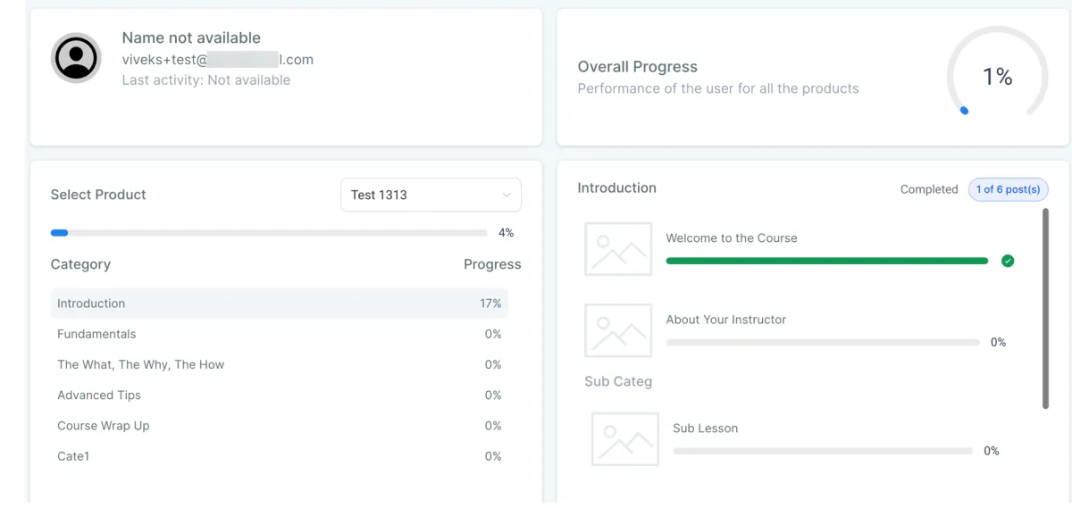 6. Produkt- und Kategoriefortschritt überwachen: Wechseln Sie zwischen verschiedenen Produkten und Kategorien, um den Fortschritt Ihrer Mitglieder in jedem spezifischen Bereich zu analysieren. Dies ermöglicht es Ihnen, die Wirksamkeit Ihrer Kurse zu bewerten und beliebte Themen oder Kategorien zu identifizieren, die bei Ihrem Publikum Anklang finden. Nutzen Sie diese Informationen, um Ihre Inhalte zu optimieren und zukünftige Angebote zu entwickeln.