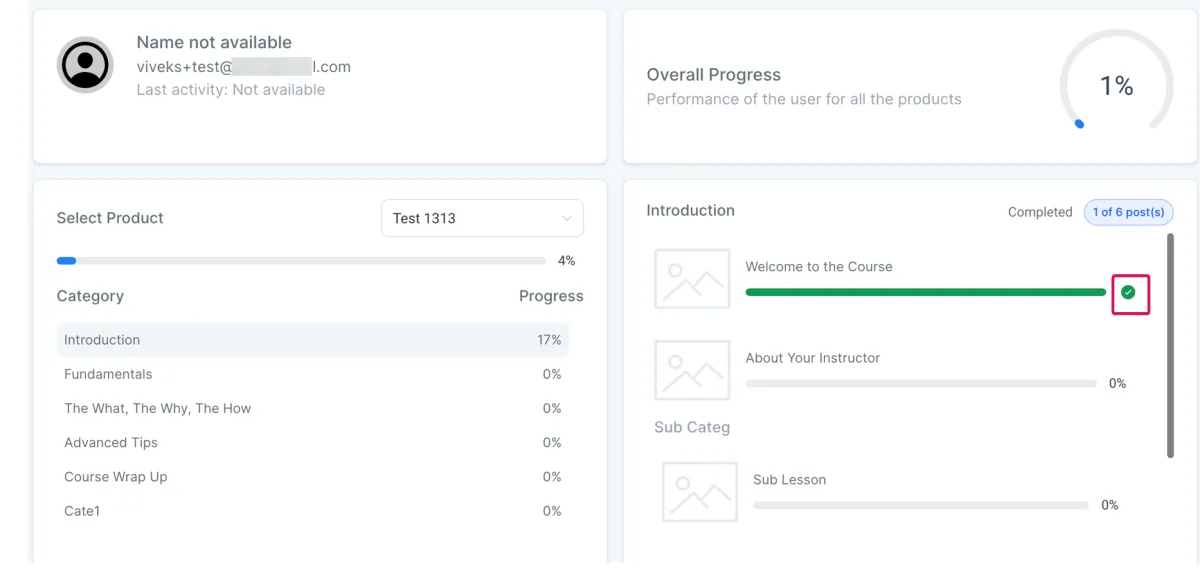 7. Beiträge als abgeschlossen markieren: Innerhalb der Mitgliederanalyse-Schnittstelle können Benutzer bestimmte Kategorien oder Lektionen als für Mitglieder abgeschlossen markieren. Dies bietet wertvolles Feedback zu deren Engagement und Fortschritt. Dieses Kontrollkästchen ermöglicht es dem Benutzer, eine spezifische Kategorie (oder Lektion) als Abgeschlossen zu markieren. Einmal als abgeschlossen markiert, zeigt die Leiste die effektiven Änderungen (für einzelne Kategorien und Produktleistung) an.